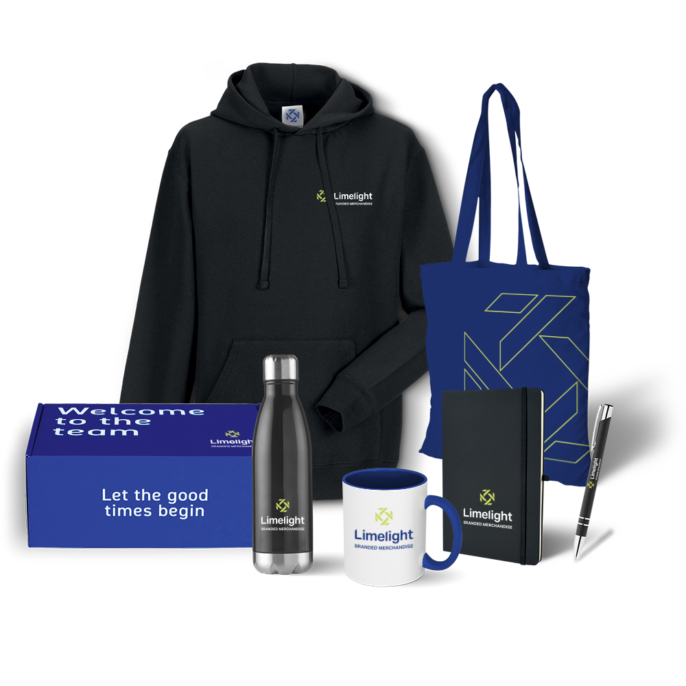 Make a lasting impression with a welcome pack. This thoughtfully curated set includes a custom-printed mailer box and inside there is an A5 notebook, a cotton shopper bag, a sleek stylus ballpen, a cosy branded hoody, a stainless-steel bottle for, and a colourful mug. All items branded with your logo.